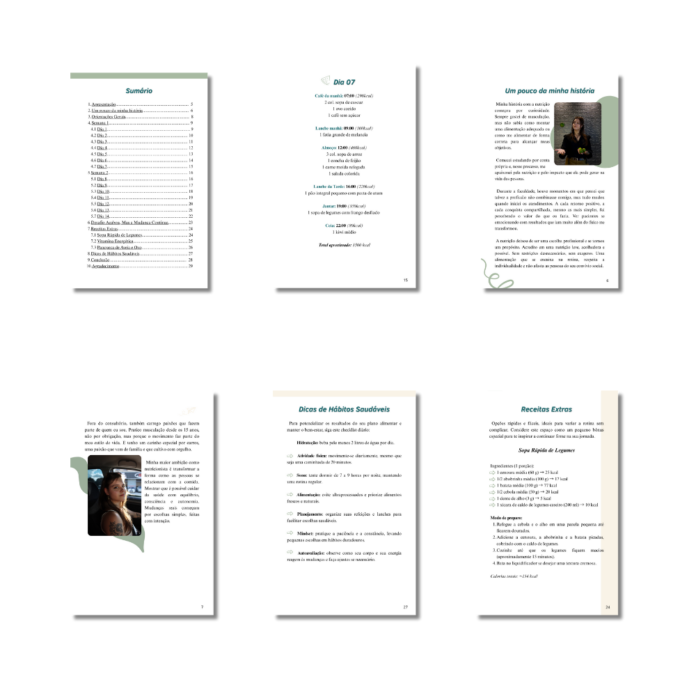 O material traz dicas práticas, receitas variadas e estratégias simples para incorporar hábitos saudáveis à sua rotina. Cada página foi pensada para ser clara, prática e aplicável à sua rotina, com dicas que facilitam a adoção de hábitos saudáveis de forma sustentável. Ideal para quem quer resultados reais em apenas duas semanas.